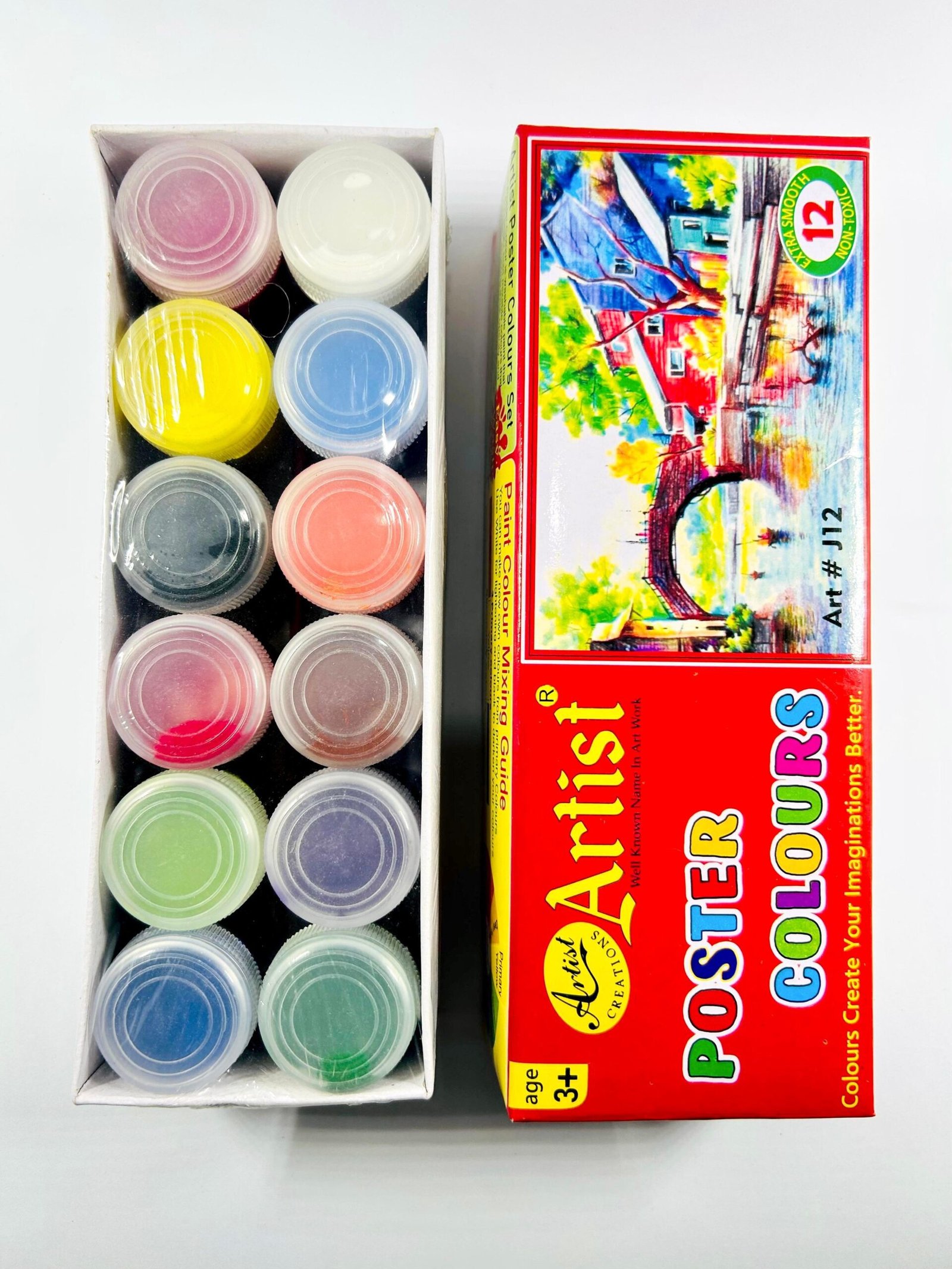 This set includes 12 medium sized, high-quality poster colors, perfect for artists, students, and hobbyists alike. Each jar contains richly pigmented paint that delivers smooth, opaque coverage and excellent blending properties. Ideal for posters, crafts, and school projects, these colors are designed to dry quickly, maintaining their brilliance and durability over time.