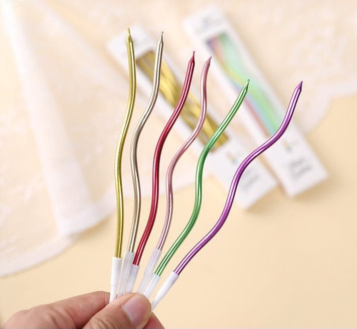 These multi-colored Pack of 6 spiral birthday candles are made of eco-friendly paraffin wax, featuring a stick shape and unscented design.