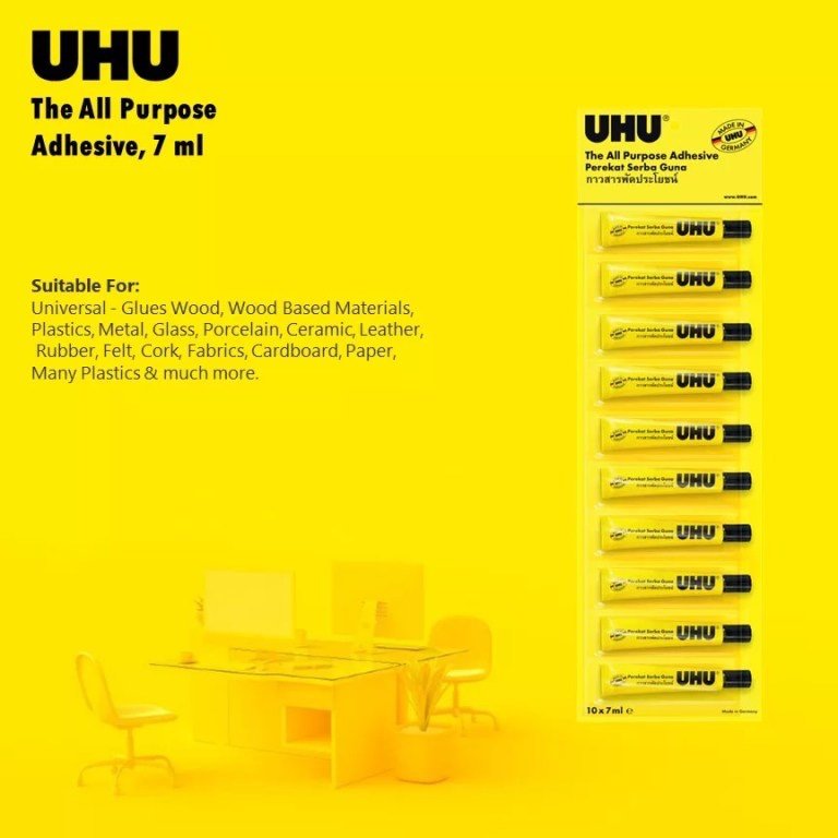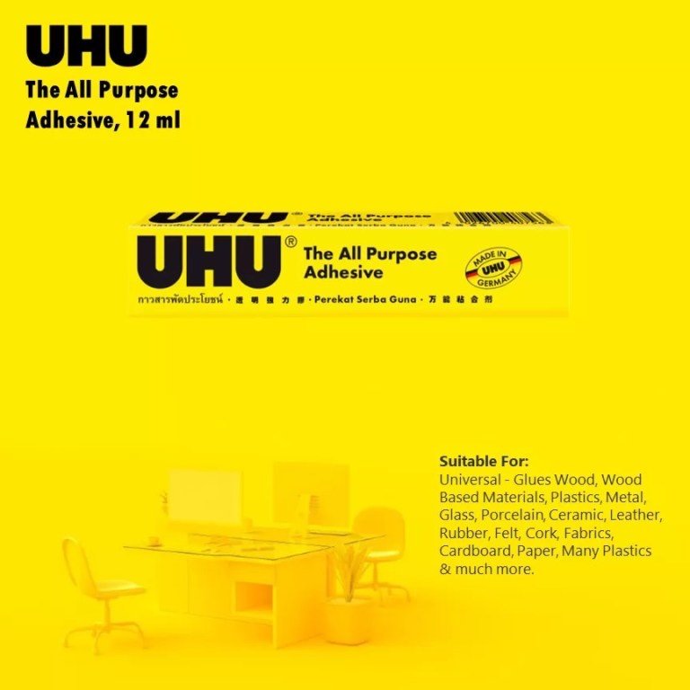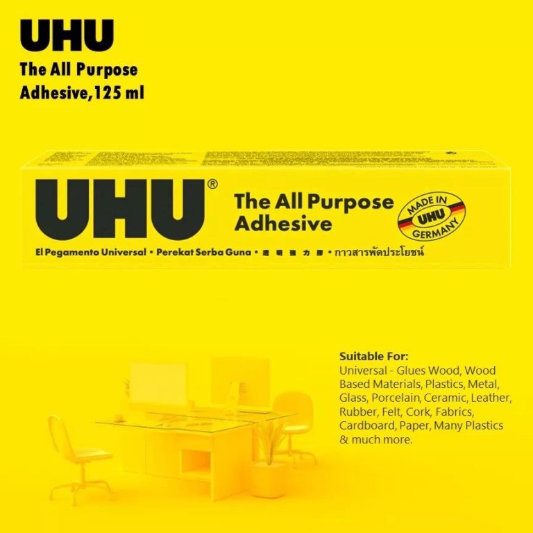Universal glue suitable for wood, wood-based materials, plastics (ABS, hard and soft PVC, Plexiglas, polystyrene), metal, glass, porcelain, ceramic, leather, rubber, felt, cork, fabrics, cardboard, paper, many plastics and much more.
